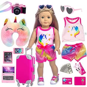 Os acessórios de viagem para bonecas atenderão às suas necessidades e o surpreenderão! 1. Acessórios abundantes, incluindo bagagem, roupas, óculos de sol, câmera, travesseiro, telefone, tablet, laptop, passaporte, , passagem aérea, dinheiro. Deixe sua boneca cheia de senso de moda e viaje lindamente. O produto não contém bonecos. Mala resistente, a alavanca pode ser ajustada para cima e para baixo, as rodas podem ser enroladas, você pode fechar e abrir facilmente. Assim como real. 3. Preparamos um cordão, você pode pendurar a câmera ao redor do pescoço da boneca, que é fácil de transportar. Almofadas são s para dormir e descansar. Uma grande variedade de acessórios para bonecas pode não apenas trazer mais diversão para as meninas, mas também cultivar a imaginação, a criatividade, a flexibilidade dos dedos e a coordenação mão-olho das crianças.