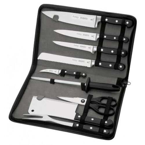 Descrição Facas: lâminas em aço inox. Cabos de policarbonato com fibra de vidro, injetado diretamente sobre a espiga da lâmina. Garfo trinchante e cutelo: lâminas em aço inox. Cabos em blenda estirênica. Chaira: haste em aço carbono revestida com cromo-duro. Cabo de polipropileno. Tesoura: lâmina aço inox. Cabo em polipropileno. Estojo sintético. Conteúdo 1 - 24001/003 - Faca para legumes 3? 1 - 24006/006 - Faca para desossar 6? 1 - 24009/008 - Faca para pão 8? 1 - 24010/006 - Faca para cozinha 6? 1 - 24011/008 - Faca para carne / Chef 8? 1 - 24214/006 - Cutelo 6? 1 - 24215/000 - Garfo trinchante 1 - 24641/008 - Chaira 8? 1 - 25922/008 - Tesoura trinchante 8? 1 - Estojo sintético Orientações Gerais Uso seguro e adequado: Tenha cuidado ao manusear produtos cortantes e perfurantes e mantenha-os fora do alcance de crianças. Para garantir a durabilidade dos produtos, recomenda-se secá-los bem após a lavagem, mesmo sendo em máquina de lavar louças. Benefícios do Produto 1. Facas: lâminas fabricadas com aço inox de altíssima qualidade que, aliado ao eficiente tratamento térmico sub-zero, confere as facas uma grande resistência ao desgaste do fio. 2. Cabos de policarbonato com fibra de vidro, têm boa resistência a impactos. 3. Garfo trinchante: a espessura do aço da lâmina garante maior resistência ao produto, evitando deformações. 4. Chaira: estrias uniformes, perfeitas para a manutenção do fio das facas. 5. Cutelo: lâmina com maior durabilidade do fio devido ao tratamento térmico. 6. Facas certificadas pelo NSF, National Sanitation Foudation, organização reconhecida internacionalmente pelas práticas de consultoria, inspeção e treinamento, voltados à garantia da sanidade de alimentos, água, ar e ambiente. 7. Podem ir à máquina de lavar louças. 8. Permanecem bonitas por muito mais tempo. 24099/021 Ean: 7891112079540