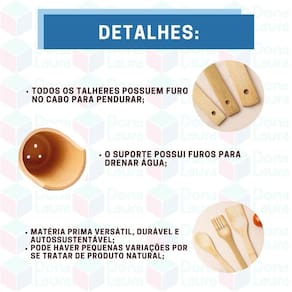 Fáceis de limpar e guardar;Leves e versáteis;Matéria prima versátil, durável e autossustentável;Resistentes ao calor e seu cabo não aquece facilmente;Não absorvente, inodoro, sem sabor, sem substância tóxica e naturalmente antibacteriano. Suas fibras não possuem poros, não havendo acúmulo de resíduos;Todos os talheres possuem furo no cabo para pendurar;O suporte possui furos para drenar água;Pode haver pequenas variações por se tratar de produto natural;não danificam o revestimento antiaderente.CUIDADOS E CONSERVAÇÃO: