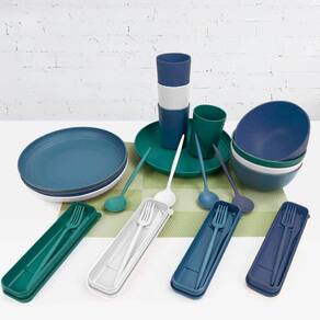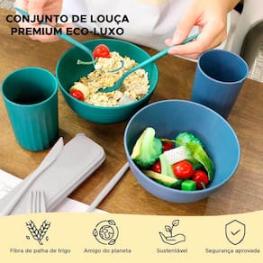 Aparelho de jantar ecológico multicolorido com peças nas cores: branco, azuis e verde. Produzido em PP com fibra de trigo, é extremamente resistente inquebrável , pode ser levado ao micro-ondas, freezer e máquina de lavar louças. É 100% reciclável e livre de BPA, fácil de limpar e não risca.
