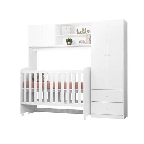 Conjugado Ternura - Peternella Móveis Estrutura em MDP Pintura UV alto brilho 4 Portas Dobradiças metálicas 2 Gavetas Corrediças metálicas 2 Nichos organizadores Espaçoso, funcional e compacto Excelente para pequenos ambientes Espaço para encaixe do berço abaixo do guarda-roupa