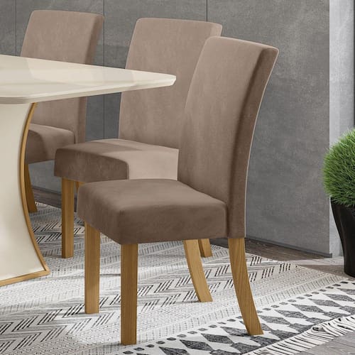 FICHA TÉCNICA: Escala de Brilho Cadeiras: Fosco Cadeiras Possui Rodízio: Não Peso Suportado por Cadeira: 120 Kg Estrutura Assento: MDP/MDF Revestimento Assento: Tecido Suede Enchimento Assento: Espuma D18 Almofada Assento: Não possui Tipo Assento: Fixo Estrutura Encosto: MDP/MDF Revestimento Encosto: Tecido Suede Enchimento Encosto: Espuma D18 Tipo Encosto: Fixo Material dos pés: MDF Medidas Montado: 95 x 44 x 55,5 Cm Peso Montado: 8,5 Kg