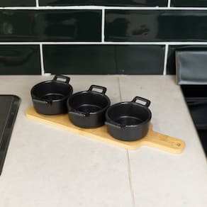 Conjunto 03 Petisqueiras Redondas de Porcelana Preta com Bandeja de Bambu Wolff - Informações