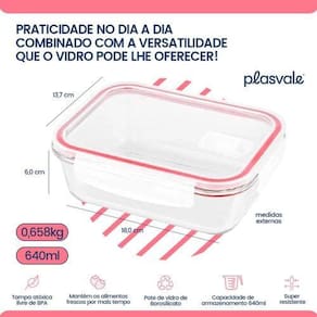 Praticidade no dia a dia combinado com a versatilidade que o vidro pode lhe oferecer Chegou o produto ideal para o preparo e armazenamento do seu alimento. Com a tampa, esses potes podem ser levados ao freezer e geladeira, tem vedação hermética que auxilia na conservação de qualquer alimento que necessite de refrigeração e as travas indicam ser o produto perfeito para aquela refeição fora de casa, pois traz segurança e que não vaza. O corpo, de vidro borossilicato, desde que sem a tampa, possibilita o preparo de alimentos no forno ou microondas, pois é resistente à altas temperaturas. Não perca a oportunidade e adquira o Pote de vidro hermético da Plasvale agora mesmo Dimensões: 18,0x 13,7 x 6,0cm Comprimento x Largura x Altura Peso: 0,658 Kg Capacidade: 640 ml Corpo resistente à temperaturas entre -20 à 400ºC Recomendações de Uso: - Adequado para Microondas Sem a Tampa . - Permitido para Máquina de Lavar Sem a Tampa - Apropriado para Forno Sem a Tampa . - Permitido para Freezer e Geladeira. Dicas Loja do Café: Lave antes do primeiro uso e não utilize produtos abrasivos. Lavar sempre com esponja macia e detergente neutro. Marca: Não Informado Ean: 7892855905370