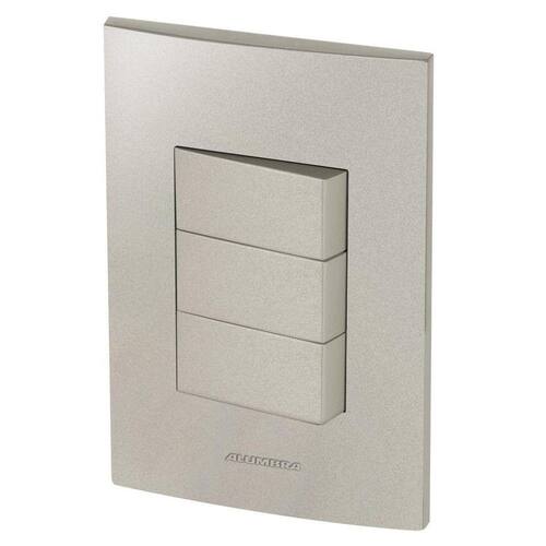 Alumbra Inova Pro Class - Placas Titanium / Módulos Titanium Linha Modular de Interruptores e Tomadas Conjunto Completo Desmontado: 1 Módulo de Interruptor Simples 2 Módulos de Interruptor Paralelo 1 Placa 4X2 para 3 Módulos 1 Suporte 4X2 2 Parafusos Cor: Titanium Para montar é apenas um click, só encaixar