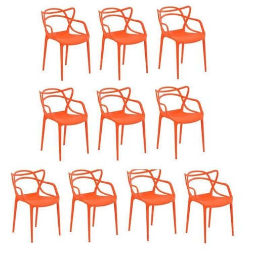 Conjunto com 10 cadeiras injetadas em peça única, com quatro pernas de apoio e sapatas incolores. Encosto vasado com assento inteiro abaulado. Empilhável. Possui certificação do Inmetro. Altura do Conjunto: 82.5 cm Ambiente: Sala de Jantar Ambiente Principal: Sala de Jantar Cor: Laranja Informação Complementar: 1x Conjunto 4 Cadeiras Allegra Laranja Largura: 53 cm Altura: 82,5 cm Peso: 4,25 kg Profundidade: 57,5 cm Necessita Montagem: Não