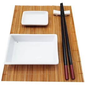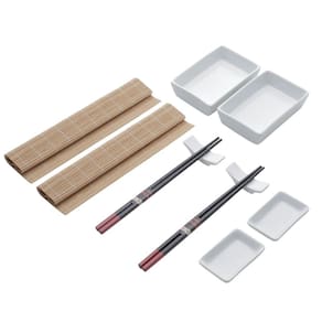 Conjunto 10 Peças P/ Sushi De Bambu Kyoto 7250A cozinha oriental, ganha, a cada dia, um espaço ainda maior entre os amantes da culinária. Foi desenvolvida em porcelana e bambu, com um design tradicional, personalizando a sua mesa, dando ao seu jantar um toque com muito charme e beleza!Fornecedor: LyorReferência: 7250Material: Cerâmica e BambúHashi preto e vinhoMolheiras brancasApoios hashi brancosPratos brancoEsteiras begeFornecedor: LyorMedida do produto: 21x30x3 cm (LxCxA)Peso do produto: 980 gramasÍtens inclusos: 2 Pares de hashi; 2 Molheiras; Apoios para hashi; e Pratos retangulares; 2 Esteiras.Medida da embalagem: 31x38x12 cm (LxCxA)Peso da embalagem: 1115 gramas*Imagens Meramente Ilustrativas*Vendido por Eletrohome. Nosso principal foco é a sua satisfação.