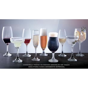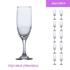 Modelo: Rioja Champagne Marca: Casa Linda Cor: Transparente Material: Vidro Capacidade: 177 ml Peso: 0,196 kg Cada Unidade Altura: 20 cm Diâmetro da boca: 5 cm Itens inclusos: Jogo com 10 Taças