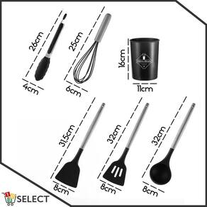 - Nome do item: Conjunto de utensílios de cozinha - Material: Silicone - Quantidade de utensílios: 11 + Suporte - Dimensões aprox do produto na embalagem: AxLxP 33,5x12,5x12,5 - Peso aprox do pacote: 1,117kg
