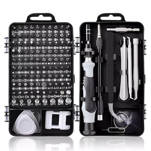 Otimize seus consertos com o Kit de Ferramentas de 115 Peças, ideal para profissionais e entusiastas de bricolagem. Equipado com 100 pontas intercambiáveis, incluindo Phillips, Flat, Torx, Pentalobe, Hex e muito mais, este conjunto oferece a solução perfeita para desmontagem e manutenção de eletrônicos, como smartphones, laptops, consoles de jogos e outros dispositivos delicados.