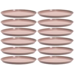 Garantia: 90 dias / Peso de cada: 138g / Cor predominante: amêndoa / Referência: 7794462512975; Dimensões de cada: 28cm (D) x 1,7cm (A); Conteúdo: 12 bandejas redonda; Material: polipropileno.