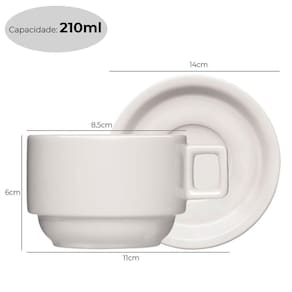 Garantia: 90 dias / Peso: 4,80kg / Cor predominante: branco / Referência: 7891658987828X12 Dimensões de cada xícara: 11cm (C) x 8,5cm (D) x 6cm (A); Capacidade de cada xícara: 210ml; Diâmetro dos pires: 14cm; Conteúdo: 12 xícaras e 12 pires; Material: 100% porcelana; *Classe Única: não são itens quebrados, lascados ou com manchas. Até 30% das peças podem possuir pequenas variações de uma peça para outra.
