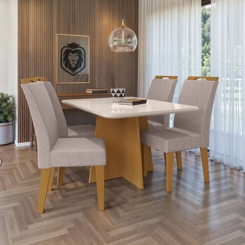 Que tal deixar o seu lar repleto de charme e bom gosto? O Conjunto Sala de Jantar Évora é perfeito, ideal para deixar sua casa mais convidativa e melhor decorada. Tenha em sua casa um produto de qualidade e beleza. Acompanha cadeira. Medida da Mesa (A x L x P): 77cm x 120cm x 90cm Peso da Mesa: 38,427 kg Mesa suporta até: 40 kg Acabamento da Cadeira/Banco: Pintura UV Acabamento da Mesa: Pintura UV Acompanha Manual de Instalação: Sim Almofada do assento: Fixa Almofada do encosto: Fixa Ambiente Principal: Sala de Jantar Cadeira/Banco estofada: Encosto e Assento Estofados Cadeira/Banco Estofada: Encosto e Assento Estofados Cadeira/Banco suporta até: 120 kg Cadeira/Banco Suporta Até: 120.0000 codigo_ean: 7900288219510 Complexidade da Montagem: Média: pode ser montado por mais de uma pessoa e/ou necessite de maior conhecimento para montagem Cor: Marrom/Bege/Off White Cor da Base: Marrom Cor das Cadeiras: Marrom Cor do Produto: Marrom/Bege/Off White Cor do Tampo: Off White Cor Secundária: Marrom De Canto (Canto Alemão): Não Enchimento do Assento: Espuma D-23 Escala de Brilho: Semi-Fosco Espessura do Tampo: 33 mm Estrutura do Assento: MDF/MDP Formato do Tampo: Retangular Itens Inclusos: 1 Mesa, 4 Cadeiras, Kit Ferragens e Manual de Montagem Linha ou Coleção: Evora Manual de Montagem e Instalação: https://product-hub-prd.madeiramadeira.com.br/718629631/documents/e53215b7-5b44-45b1-8e07-2bbbf8c7211a315334253101755801826324.pdf Marca: Art Panta Material da Base da Mesa: MDF/MDP Material da Estrutura da Cadeira: MDF/MDP Material do Tampo: MDF/MDP Material Principal: MDF/MDP Medida da Cadeira/Banco (A x L x P): 104cm x 43cm x 50cm Medida do Tampo (L x C x E): 90cm x 120cm x 33mm Mesa Dobrável: Não Mesa Extensível: Não Montagem Flex: NAO Necessita Montagem: Sim Origem do Produto: Nacional Peso da Cadeira/Banco: 19,19 kg Possui Apoio para Braços: Não Possui Apoio Para os Pés: Não Possui Prateleiras: Não Possui Suporte Giratório: Não Possui Vidro: Sim Quantidade de Cadeiras: 4 Quantidade de Lugares: 04 Recomendações de Uso, Manutenção e Limpeza: Pano levemente umedecido com água, seguido de pano seco, não utilizar produtos químicos ou abrasivos. Revestimento da Cadeira/Banco: Linho Sistema de Montagem: Parafusos Tipo de Assento: Fixo Tipo de Encosto: Estofado
