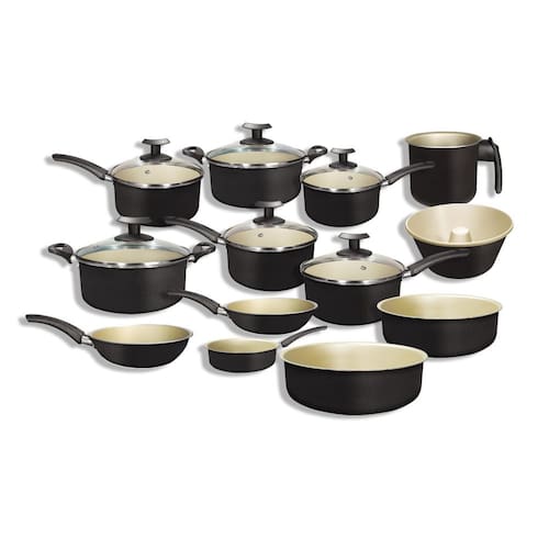 O kit é composto por: 01 - Panela de 14cm de diâmetro 01 - Panela de 16cm de diâmetro 01 - Panela de 18cm de diâmetro 01 - Panela de 20cm de diâmetro 01 - Caçarola de 16 cm de diâmetro 01 - Caçarola de 20 cm de diâmetro 01 - Fervedor de 14 cm de diâmetro 01 - Frigideira de 16 cm de diâmetro 01 - Frigideira de 18 cm de diâmetro 01 - Frigideira de 20 cm de diâmetro 01 - Forma de Bolo 25 cm de diâmetro 01 - Forma de Bolo 30 cm de diâmetro 01 - Assadeira retangular 30 cm de diâmetro