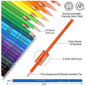 A paleta ampla contempla 180 cores vibrantes, permitindo preenchimento, sombreamento, mistura e criação de gradientes em trabalhos artísticos, ilustrações e livros de colorir. Cada lápis é identificado na extremidade com nome e número da cor, o que facilita reconhecer e repetir combinações cromáticas em diferentes projetos.