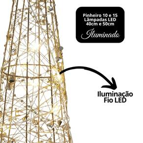 O kit inclui 2 árvores iluminadas em tamanhos diferentes (50cm e 40cm), confeccionadas em estrutura metálica aramada no formato de cone e decoradas com miçangas douradas e mini bolinhas cristal, que refletem a luz e criam um efeito luminoso sofisticado. Cada árvore possui fio LED branco quente, alimentado por pilhas, garantindo iluminação suave e acolhedora — perfeita para decorar salas, mesas, aparadores ou vitrines.