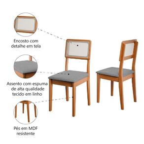 Importante sobre a entrega: A entrega é realizada até a portaria ou porta de entrada do endereço indicado, desde que o acesso seja permitido. Para locais com portaria, a entrega será feita no piso térreo. Não realizamos montagem, desmontagem, transporte por escadas ou içamento. É responsabilidade do cliente verificar se as dimensões do produto são compatíveis com portas, elevadores e corredores. Evite imprevistos: confira todos os detalhes antes de concluir sua compra. MEDIDAS:: [ A ] = 92 cm [ L ] = 46 cm [ P ] = 40 cm | PESO:: 6,60kg (cada) | PESO SUPORTADO:: 110 Kg cada | MARCA:: Dobuê | TECIDO:: Linho | PÉS:: Sapatas Plásticas | DIFERENCIAL:: Material MDF de alta resistência, cadeiras com assento acolchoado, encosto da cadeira com tela. | MODELO:: Conjunto 2 Cadeiras Encosto em Tela Sala de Jantar Santiago | ACABAMENTO:: Veluplus | ESTRUTURA:: MDF | REVESTIMENTO ASSENTO:: Espuma D20 | SISTEMA DE MONTAGEM:: Parafusos e porcas cilíndricas | ITENS INCLUSOS:: 2 Cadeiras, 1 manual de montagem e 1 kit parafusos | INSTRUÇÕES E CUIDADOS:: Limpar com pano levemente umedecido com água, não utilizar produtos abrasivos | GARANTIA:: 3 meses pelo fabricante. | AVISO:: Importante sobre a entrega: A entrega é realizada até a portaria ou porta de entrada do endereço indicado, desde que o acesso seja permitido. Para locais com portaria, a entrega será feita no piso térreo. | Altura da cadeira: 92 | Inclui manual de montagem: sim | Largura do assento: 46 | Profundidade do assento: 40 | Quantidade de cadeiras por conjunto: 2 | Requer montagem: sim | Cor: Madeirado / Cinza Marca: Não Informado