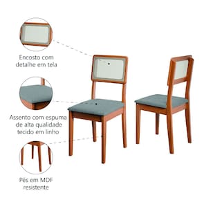 MEDIDAS: [ A ] = 92 cm [ L ] = 46 cm [ P ] = 40 cm PESO: 6,60kg (cada) PESO SUPORTADO: 110 Kg cada MODELO: Conjunto 2 Cadeiras Encosto em Tela Sala de Jantar Santiago MARCA: Dobuê ESTRUTURA: MDF ACABAMENTO: Veluplus TECIDO: Linho REVESTIMENTO ASSENTO: Espuma D20 PÉS: Sapatas Plásticas DIFERENCIAL: Material MDF de alta resistência, cadeiras com assento acolchoado, encosto da cadeira com tela. SISTEMA DE MONTAGEM: Parafusos e porcas cilíndricas ITENS INCLUSOS: 2 Cadeiras, 1 manual de montagem e 1 kit parafusos INSTRUÇÕES E CUIDADOS: Limpar com pano levemente umedecido com água, não utilizar produtos abrasivos GARANTIA: 3 meses pelo fabricante.
