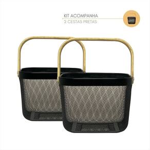Cesta Organizador em Tela Metálica Preta com Alça de Madeira - 24,5 x 24,5 x 18 cmOrganize com charme, ventile com praticidade e decore com estiloA Cesta Organizadora em Tela Metálica com Alça de Madeira é o item perfeito para quem busca unir funcionalidade com design contemporâneo. Fabricada com estrutura metálica resistente e acabamento em pintura preta fosca, esta cesta proporciona um visual sofisticado e ao mesmo tempo discreto - ideal para compor diferentes ambientes da casa com harmonia e personalidade.Características Técnicas:Material do corpo: Tela metálica em aço com pintura eletrostática acabamento fosco, durável e resistente à corrosão .Material das alças: Madeira natural envernizada acabamento suave ao toque, com efeito visual quente e acolhedor .Dimensões:24,5 cm largura 24,5 cm profundidade 18 cm altura Vantagens e Aplicações:Organização multifuncional: ideal para armazenar toalhas de mão, rolos de papel, cosméticos, sabonetes, acessórios de cabelo, temperos, pacotes de alimentos, potes de mantimentos, talheres, panos de prato, entre outros.Estilo versátil: combina perfeitamente com banheiros modernos, cozinhas abertas, lavanderias planejadas, home offices, espaços gourmet ou prateleiras decorativas.Boa ventilação: a estrutura vazada de tela permite a circulação de ar, ideal para produtos que precisam respirar, como esponjas, alimentos secos ou tecidos.Fácil de transportar: as alças de madeira anatômicas facilitam o manuseio mesmo quando a cesta está cheia.Visual decorativo: o contraste entre o metal preto e a madeira clara oferece um toque natural e elegante à decoração.Images IlustrativasDica de uso:Monte um conjunto com outras cestas similares e crie um sistema de organização modular. Combine com etiquetas ou tags para uma organização ainda mais eficiente e charmosaEssencial para quem valoriza ambientes organizados, funcionais e visualmente agradáveis.Com esta cesta, até as pequenas tarefas do dia a dia ganham um toque de bom gosto e praticidade.