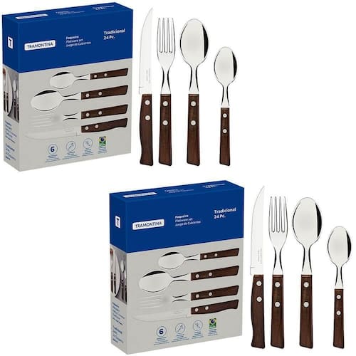 INFORMAÇÕES DO FAQUEIRO TRAMONTINA 24 PEÇAS COM LAMINAS DE AÇO INOX E CABOS DE MADEIRA - Lâminas de aço inox. - As lâminas das facas têm maior durabilidade do fio devido ao tratamento térmico. - As lâminas do garfo e colher contam com maior espessura e uma estampagem do aço que garante maior resistência, evitando deformações. - Cabos de madeira natural com rebites de alumínio.