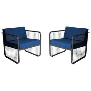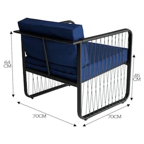 Conjunto 2 Poltronas área Externa Fibra Sintética Santiago Preto/azul O Conjunto 2 Poltronas Santiago para Area Externa sao a escolha ideal para quem busca conforto, durabilidade e elegancia em ambientes ao ar livre. Com estrutura em aluminio e acabamento em fibra sintetica. O assento estofado com tecido impermeavel proporciona conforto e praticidade, tornando o uso ainda mais agradavel. Produzidas de forma artesanal, combinam sofisticacao e exclusividade no design. Ideais para areas gourmet, areas externas, churrasqueiras, ediculas e outros espacos que exigem um toque especial de charme e aconchego.