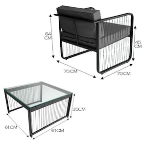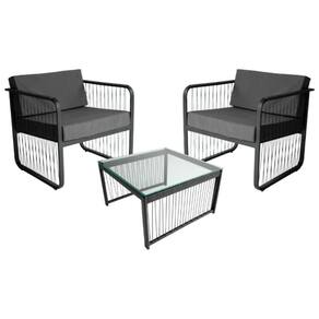 Conjunto 2 Poltronas E Mesa Centro Fibra Sintética Santiago Preto/cinza Que tal trazer sofisticacao e conforto para sua area externa com o Conjunto Santiago. Composto por 2 Poltronas e 1 mesa de centro, este conjunto e ideal para areas gourmet, churrasqueiras, ediculas e outros ambientes externos. Sua estrutura em aluminio e acabamento em fibra sintetica garantem resistencia e durabilidade, enquanto o design moderno e a producao artesanal conferem um toque exclusivo e unico ao seu espaco. As poltronas possuem encosto e assentos estofados com tecido impermeavel, oferecendo maior conforto e praticidade para longos momentos de relaxamento. Perfeito para quem deseja um ambiente elegante e funcional para receber amigos e familia.