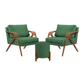 Conjunto 2 Poltronas Mona Decorativa e 1 Puff Thor Estofado Base Madeira Maciça Linho Verde