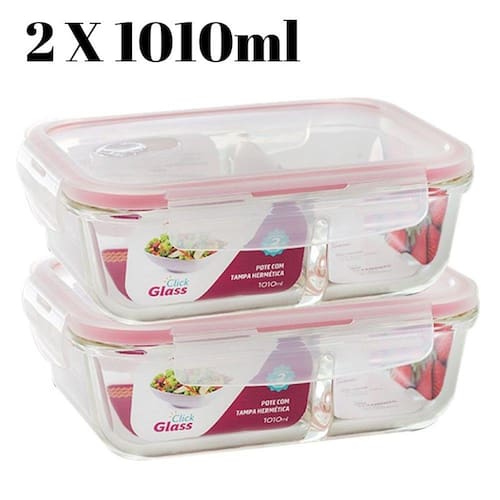 Conjunto 2 Potes de Vidro com Tampa Hermética Retangular com Divisória 1010ml