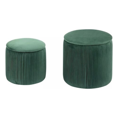 Dimensões: Puff menor: 36 cm de altura e 35 cm de diâmetro. Puff maior: 44 cm de altura e 42 cm de diâmetro. Material: Estrutura robusta revestida em tecido verde de alta qualidade. Capacidade de Peso: Cada puff suporta até 100 kg. Cor: Verde, trazendo uma sensação de tranquilidade e sofisticação ao ambiente. Funcionalidades: