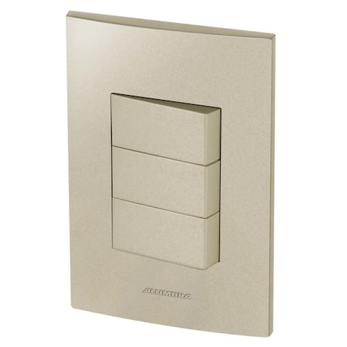 Alumbra inova pro class - placas champanhe / módulos champanhe linha modular de interruptores e tomadas conjunto completo desmontado: 2 módulos de interruptor simples 1 módulo de interruptor 1 placa 4x2 para 3 módulos 1 suporte 4x2 2 parafusos cor: champanhe para montar é apenas um click, só encaixar