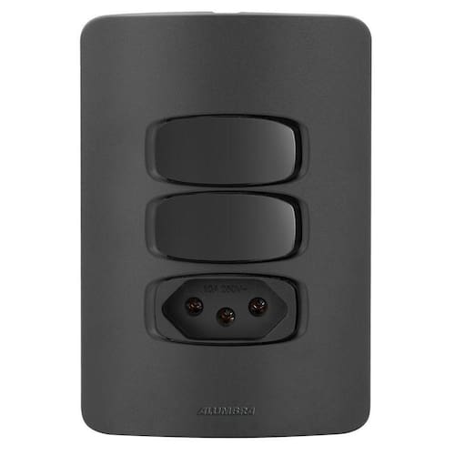 Alumbra Gracia Black Maxx - Interruptores e Tomadas Conjunto Completo Desmontado com: 2 Módulos de Interruptores Simples 1 Módulo de Tomada 10A 1 Placa para 3 módulos 4X2 1 Suporte 4X2 2 Parafusos Cor: Preto Para montar é apenas um click, apenas encaixar