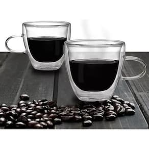 Contém: 2 xícaras de vidro dupla camada Capacidade: 120ml Dimensão: 6cm x 6cm Material: vidro resistente Modelo: dupla camada Tipo de bebida: todo tipo de bebida, em especial bebidas quente. Marca: Kadê