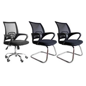 Composto por duas Cadeiras Executivas fixas com encosto em tela, assento revestido em tecido, braços e base fixos, que garantem o conforto e uma postura correta ao usuário e uma Cadeira Diretor com rodinha moderna, super confortável, com regulagem de altura em gás, reclinável com acostamento e assento em tela.