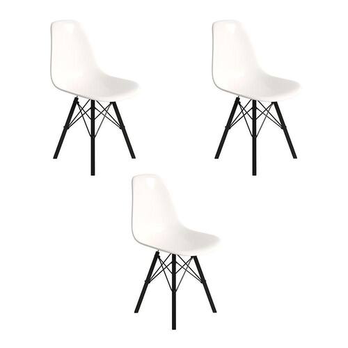 ATENÇÃO AS IMAGENS SÃO MERAMENTE ILUSTRATIVAS E PODEM SOFRER VARIAÇÕES DE COR E PEQUENOS DETALHES DE ACORDO COM O SEU MONITOR, ILUMINAÇÃO DO AMBIENTE E ATÉ MESMO A SUA PERCEPÇÃO VISUAL.Conjunto 3 Cadeiras Eames Design Moderno Tubo de Ferro Preto Assento Branco