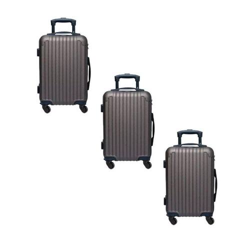 03 malas de bordo pequenas 20 polegadas Material: abs 04 rodas duplas 360 Carrinho embutido com regulagem de altura Alça superior Bolso interno de separação com zíper Fechadura Cinta elástica cruzada com trava