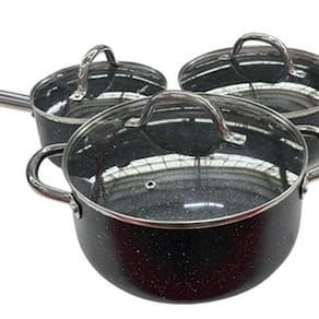 Revestimento marmorizado antiaderente, permitindo cozimento uniforme e sem aderência Fabricado em alumínio de alta qualidade, garantindo resistência e durabilidade Fácil de limpar e ideal para diversos tipos de preparo Design elegante e moderno, combinando funcionalidade e estilo Um conjunto perfeito para quem busca praticidade e eficiência na cozinha."