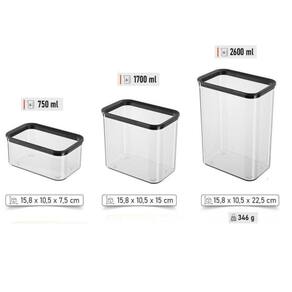 Conjunto 3 Potes Herméticos de Plástico Organize a sua despensa com potes herméticos e práticos Ideal para armazenar alimentos como grãos, massas, cereais e petiscos com segurança e praticidade. Fabricados em plástico PP livre de BPA, os potes possuem tampa com vedação em silicone, garantindo fechamento hermético contra umidade, ar e insetos. Design quadrado e empilhável para otimizar o espaço, transparência para visualizar o conteúdo e resistência a micro-ondas e freezer aumentam a versatilidade. Material: PP livre de BPA; tampa com vedação de silicone Formato quadrado e empilhável para melhor aproveitamento de espaço Transparência que facilita visualizar o conteúdo Resistentes a micro-ondas e freezer Disponíveis em cores Itens Inclusos: 01 Pote 750 ml 01 Pote 1700 ml 01 Pote 2600 ml Especificações: Pote 2600 ml: 22,5 cm altura x 10,8 cm largura x 16,5 cm comprimento Pote 1700 ml: 15 cm altura x 10,8 cm largura x 16,5 cm comprimento Pote 750 ml: 7,5 cm altura x 10,8 cm largura x 16,5 cm comprimento Material: Plástico Peso conjunto: 880 g Cor: Pote transparente com tampa preta Conjunto: 01 três potes herméticos de plástico. Compre agora e organize já a sua despensa. Marca: Não Informado Ean: 7891106023528
