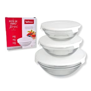 Conjunto 3 Potes Tigela De Vidro 200ml 400ml 550ml Tampa E Trava Branca De Plástico Armazenar Comida Geladeira Salada