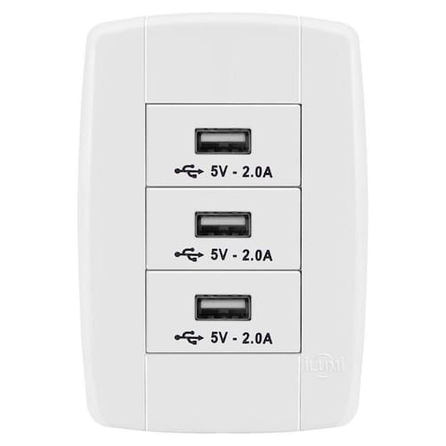 Linha Modular Ilumi Lev Conjunto Completo e Desmontado com: 3 Módulos de Tomada USB - 5V - 2.0A 1 Placa 4X2 com suporte para 3 Módulos 2 Parafusos Para montar é fácil, apenas um click. só encaixar