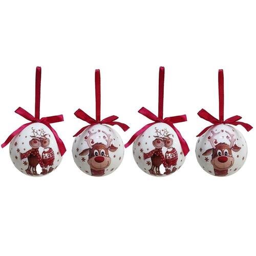Conjunto 4 Bolas de Natal Decorada Branco Laqueado Premium Renas Love Com Laço Vermelho 7,5cm