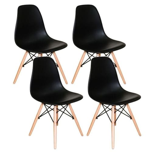 Conjunto 4 Cadeiras Charles Eames Eiffel Concha Fixa - Preto Cadeira Eiffel Eames Base Madeira A CADEIRA CHARLES EAMES EIFFEL foi criada nos anos 50, é vencedora do Museu de Nova York da concorrência Design de Mobiliário Low-Cost Arte Moderna Internacional. Sua base é em MADEIRA no formato de uma torre faz com que o ambiente não fique sobrecarregado. Adequa-se perfeitamente para compor conjunto de mesa de jantar ou qualquer outro ambiente em sua casa ou escritório. Ideal para receber amigos e familiares com um toque de elegância e charme. As pernas da cadeira são em madeira e fios de aço preto no qual garantem estabilidade à cadeira.