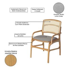 AS IMAGENS SÃO MERAMENTE ILUSTRATIVAS E PODEM SOFRER VARIAÇÕES DE COR E PEQUENOS DETALHES DE ACORDO COM O SEU MONITOR, ILUMINAÇÃO DO AMBIENTE E ATÉ MESMO A SUA PERCEPÇÃO VISUAL.Conjunto 4 Cadeiras de Jantar FlorenÃa em Madeira Jequitibà Natural BraÃo Encosto Palha Linho Cinza