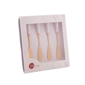 Conjunto 4 Espátulas em Inox para Chá com Cabo de Cerâmica Levar os artigos de inox para composição da mesa é a forma ideal de garantir charme e delicadeza. O Jogo de espátulas, além de funcionais, são perfeitos para completar a decoração e trazer praticidade à mesa.
