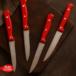 As facas para carne da Betty Crocker foram projetadas para cortar facilmente todos os tipos de carnes, garantindo praticidade e eficiência no preparo das refeições.