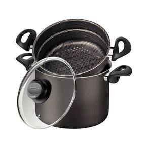 Com o jogo 4 funções Tramontina Paris em alumínio com revestimento interno e externo em antiaderente Starflon Max chumbo com tampa de vidro ficou muito mais prático preparar legumes e vegetais cozidos no vapor e ter uma alimentação muito mais saudável. Produzido em alumínio com espessura de 1,8 milímetros e com revestimento interno e externo de antiaderente Starflon Max, ele cozinha os alimentos de maneira rápida, evitando que eles grudem em sua superfície. Sua tampa é em vidro temperado com saída de vapor e as alças são em baquelite antitérmico e pegador em nylon, dois materiais que não aquecem e oferecem um manuseio mais e confortável. O cozi-vapore ainda é muito fácil de limpar e pode ser levado à máquina de lavar louças, otimizando suas tarefas do dia a dia!