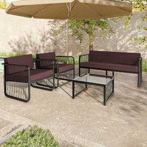 A namoradeira e as poltronas possuem assentos estofados com tecido impermeavel, proporcionando conforto durante longas horas de lazer. O design artesanal de cada peca garante exclusividade, fazendo deste conjunto uma opcao perfeita para quem busca estilo e funcionalidade.