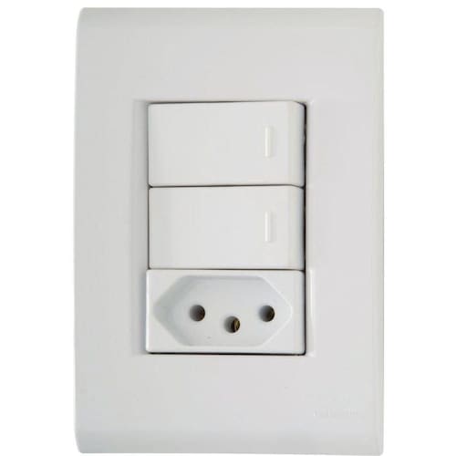 Conjunto 4" X 2" De 2 Interruptores Simples + 1 Tomada 2p+t 20a 250v - Tramontina Principais Características: - As placas e módulos da linha Liz são fabricadas em termoplástico com acabamento brilho na cor branca, que não retém poeira, unindo qualidade e praticidade; - O sistema é modular, com gradual ajuste entre placa e suporte, proporcionando perfeito acabamento da placa com a parede; - Possuem furo oblongo para facilitar a fixação e a regulagem da placa à parede; - Além disso, possuem furos para a fixação em parede de madeira; - A fixação não é aparente; - Acompanham suporte e parafusos para a instalação. Especificações Tipo Simples Acabamento Brilho Corrente 10A (interruptor); 20A (tomada) Cor Branco Tensão Máxima 250 V Linha Liz Material Termoplástico Composição Placa 3 módulos, 2 interruptores e 1 tomada Altura 14 cm Largura 10 cm Comprimento 15 cm Peso Bruto 0.12 kg