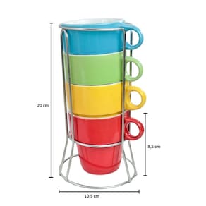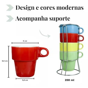 Informações Técnicas: Composição: Porcelana. Capacidade de cada xícara: 200ml. Quantidade de peças: 4 xícaras + suporte. Altura da caneca: 8,5cm. Comprimento com a alça: 11cm. Diâmetro superior: 8cm. Diâmetro inferior: 5,6cm. Peso de cada xícara: 254gramas. Altura do suporte: 20cm. Diâmetro superior do suporte: 9 cm. Diâmetro inferior do suporte: 10,5cm. Validade: Indeterminado.