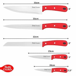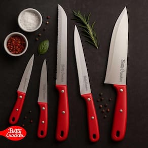 O Jogo com 5 Facas de Cozinha em Aço Inoxidável da Betty Crocker combina resistência, funcionalidade e estilo em cada detalhe.