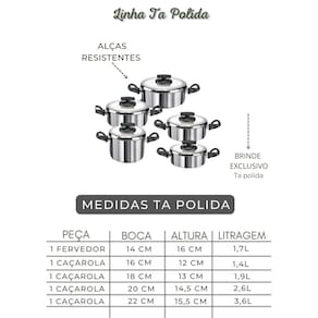 Modelo: Conjunto aluminio forte com tampa, Modelo com cordões em alumínio na altura de cada boca da panela o que gera uma estabilidade maior na peça, contém também extensões nas alças que evitam o contato com o fogo e as preservam por mais tempo, além destes detalhes ainda conta com tampa em todos os itens. Quantidade de peças:5. Tamanho das peças: - Caldeirão nº 14 - Caçarola nº 16 - Caçarola nº 18 - Caçarola nº 20 - Caçarola nº 22